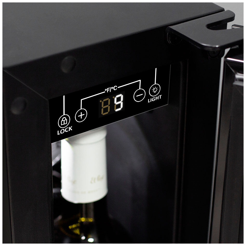 - Надёжная защита и презентация – дверца с тройным стеклом и УФ-фильтром защищает вина от вредного света. Демонстрационная LED-подсветка бережно подсвечивает содержимое, подчёркивая эстетику минималистичного дизайна.