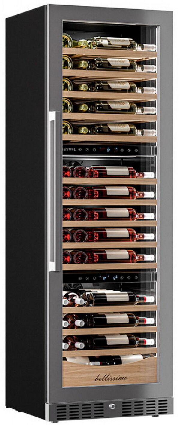 - Уникальная трёхзонная система климат-контроля – внутреннее пространство разделено на три полностью независимые температурные зоны: верхняя (+5°C…+20°C), средняя (+5°C…+12°C) и нижняя (+12°C…+20°C). Это позволяет одновременно создавать индивидуальные условия для игристых, белых, красных и креплёных вин, а также выделять зону для их оперативного охлаждения до температуры сервировки.