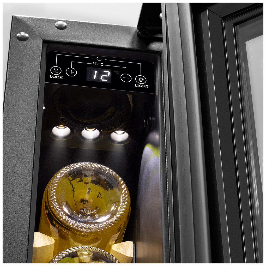 - Презентабельный дизайн и защита – дверца с тройным стеклом, оснащённым УФ-фильтром, и утопленная ручка создают лаконичный внешний вид. 6 держателей из массива бука надёжно фиксируют бутылки и гасят вибрации. Демонстрационная LED-подсветка мягко освещает коллекцию.
