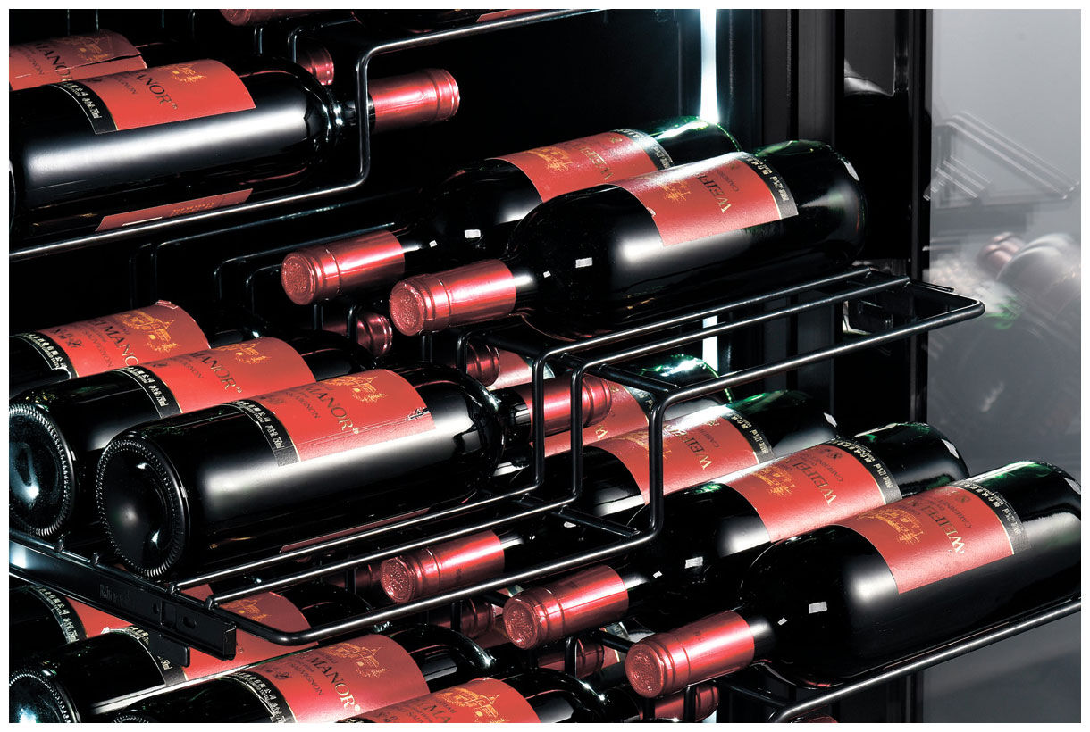 - Гибкий температурный режим для разных сортов – широкий диапазон регулировки температуры от +5°C до +20°C позволяет создать идеальные условия для хранения белых, розовых, красных вин и игристых сортов.