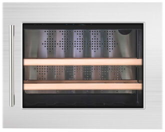 - Низкопрофильный дизайн для интеграции в стиле хай-тек – высота 45,5 см позволяет встроить шкаф в цокольную часть кухонного острова, барную стойку или под столешницу, создавая эффектную металлическую панель, которая гармонично сочетается с другой техникой из нержавеющей стали.